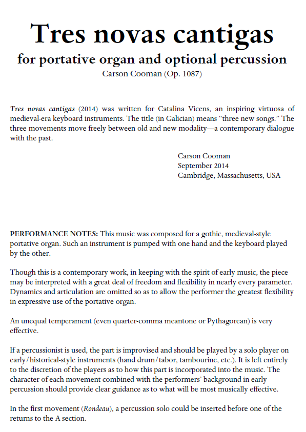 Carson Cooman: Tres novas cantigas (2014) for portative organ and opt. percussion [PDF musical score]